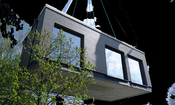 Schneckenhaus am Haken: Ein Kran stellt einen Wohnwürfel mit bodentiefen Fenstern und Holzlamellen-Fassade ab.